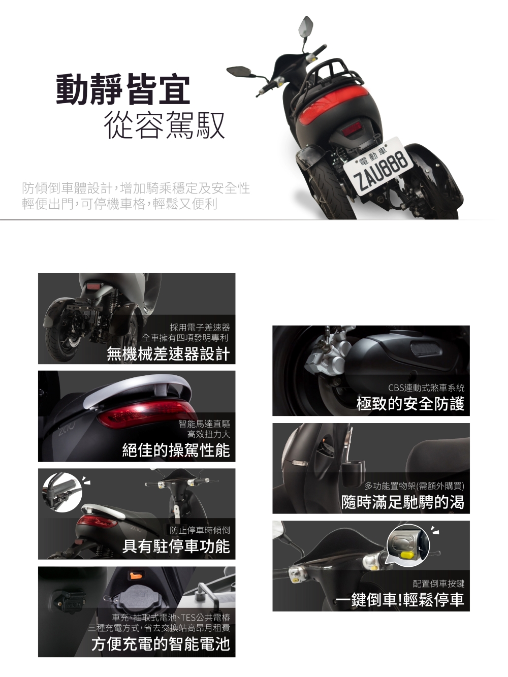 *爬坡能力/最高時速/續航里程,皆以騎士75公斤條件下進行測試,實際使用因車輛乘載重量、個人騎乘習慣、行駛模式、騎乘路況與天候狀況等綜合因素不同將有所差異,使用與規格請以實車為主。